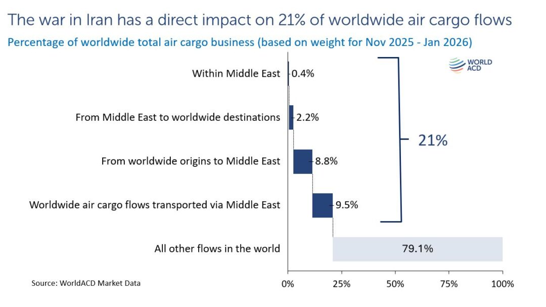 According to new analysis by WorldACD Market Data, approximately 21 percent of worldwide air cargo flows are directly linked to the Middle East when measured by weight between November 2025 and January 2026.